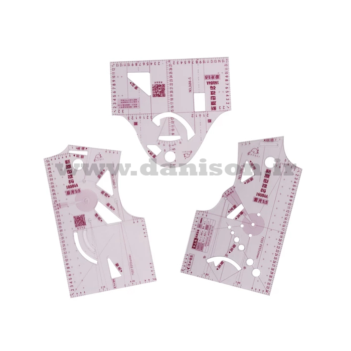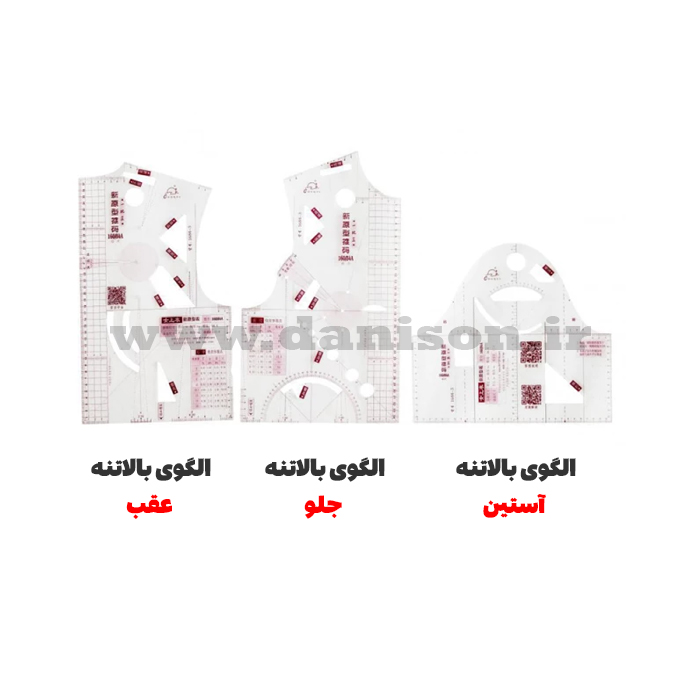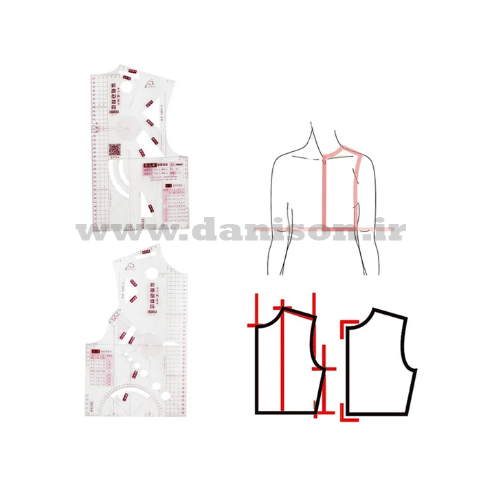 خط کش الگو آموزشی طراحی بالاتنه شامل سه تکه بالاتنه عقب، بالاتنه جلو و آستین است.