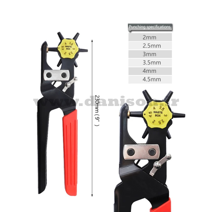 سایز پانچ انبر سوراخ کن خورشیدی PK-500 از 2 الی 4.5 میلیمتر و مناسب برای انواع چرم و کمربند است.